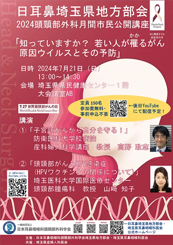 日本耳鼻咽喉科頭頸部外科学会埼玉県地方部会・埼玉県耳鼻咽喉科医会(埼玉県さいたま市)は、埼玉県産婦人科医会と協力し、HPV(ヒトパピローマウイルス)とがんの関係性を専門家から学べる市民公開講座「知っていますか?若い人が罹るがん 原因ウイルスとその予防」を、2024年7月21日(日)に埼玉県県民健康センターで開催いたします。