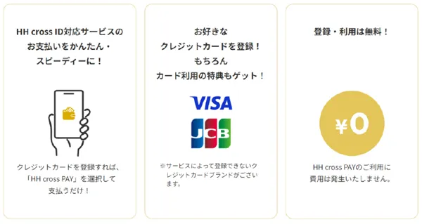 「HH cross PAY」は、お客様が登録した「HH cross ID」と、お持ちのクレジットカードや銀行口座を紐づけることにより、同IDを導入しているサービスのご利用時に、そのお支払いの都度、クレジットカード情報などを入力する手間なく、スムーズにお会計することができるペイメントサービス※1です。