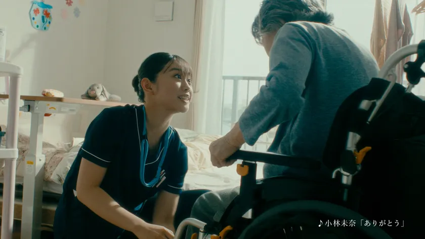 今回のTVCMでは、IKOIナーシングホームに勤務する介護士役を、女優の森山未唯が熱演。森山は、TBS系バラエティー番組「水曜日のダウンタウン」内の「名探偵津田」でその演技や容姿で話題となった24歳。今回のCMでも「とことんやること」がモットーの介護士役に、明るく元気な体当たりの演技でチャレンジ。
