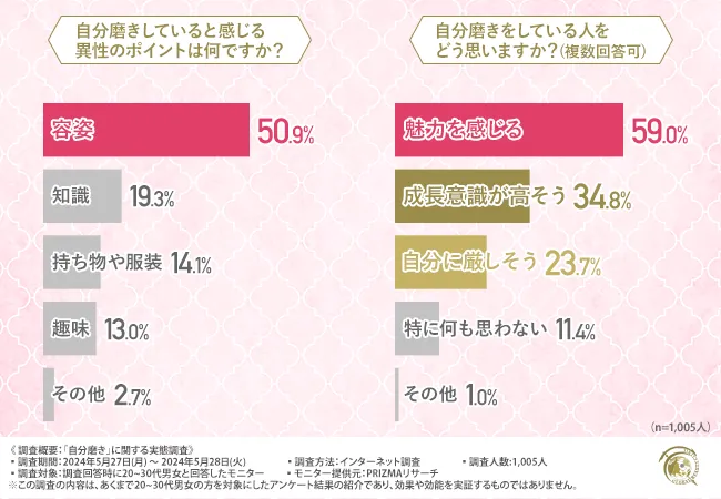 今回の調査で、20~30代の男女の半数以上が自分磨きを行っていることが明らかになりました。