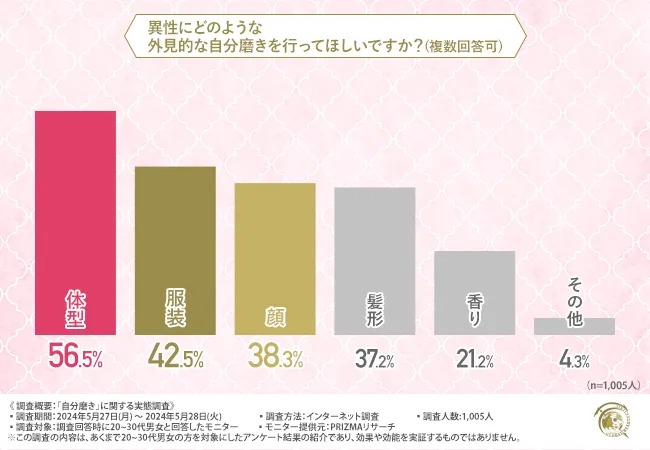 続いて、「異性にどのような外見的な自分磨きを行ってほしいですか?(複数回答可)」と質問したところ、『体型(56.5%)』と回答した方が最も多く、次いで『服装(42.5%)』『顔(38.3%)』と続きました。