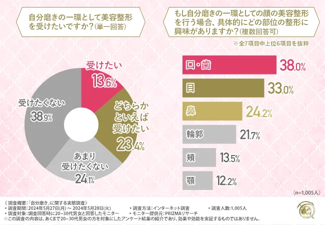 さらに、自分磨きの一環としての美容整形は約4割が肯定的で、目・鼻・口の整形に興味がある方が多いようです。