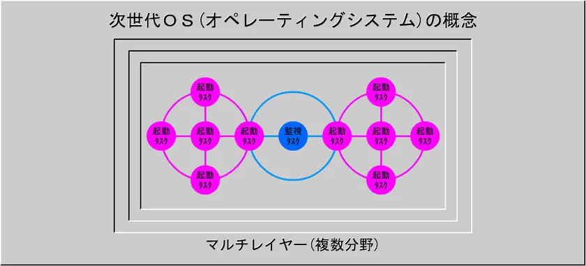 ゆえに、汎用人工知能(AGI)の構築には、次世代AI監視タスクと次世代AIタスク群を実装するマルチレイヤー群(複数分野)を構成する次世代OSの開発が必要になります。