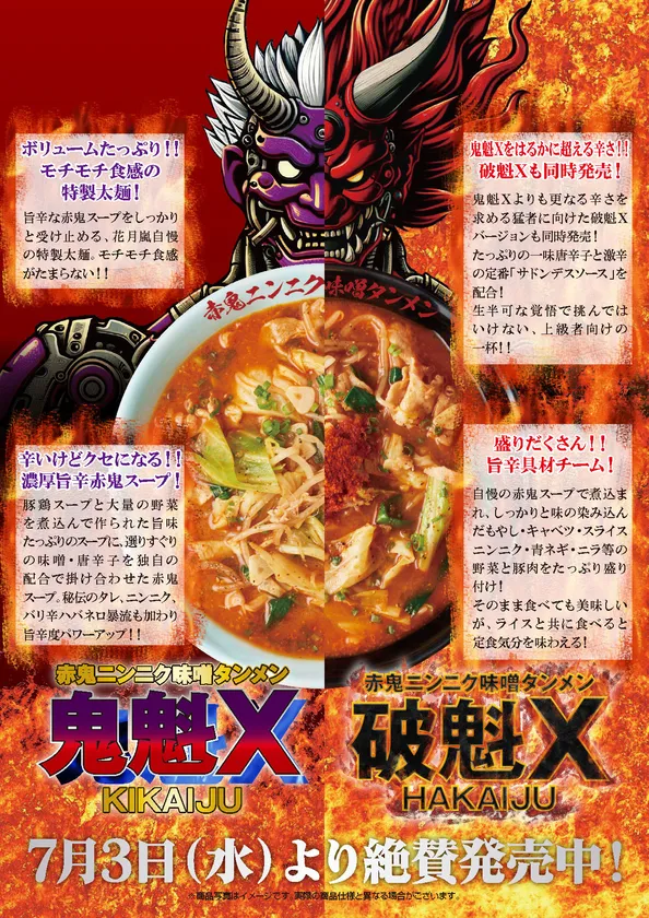 時は来た・・復活の赤鬼 異なる辛さ二鬼襲来!! 『赤鬼ニンニク味噌タンメン鬼魁X』 『赤鬼ニンニク味噌タンメン破魁X』 7月3日(水)より期間限定発売!