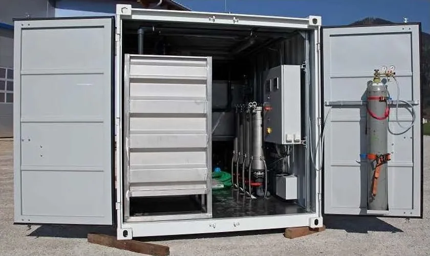 約6m×2.4m×2.6m(L×W×H)の大きさのコンテナの中に濾過を行うための処理装置が入っています。