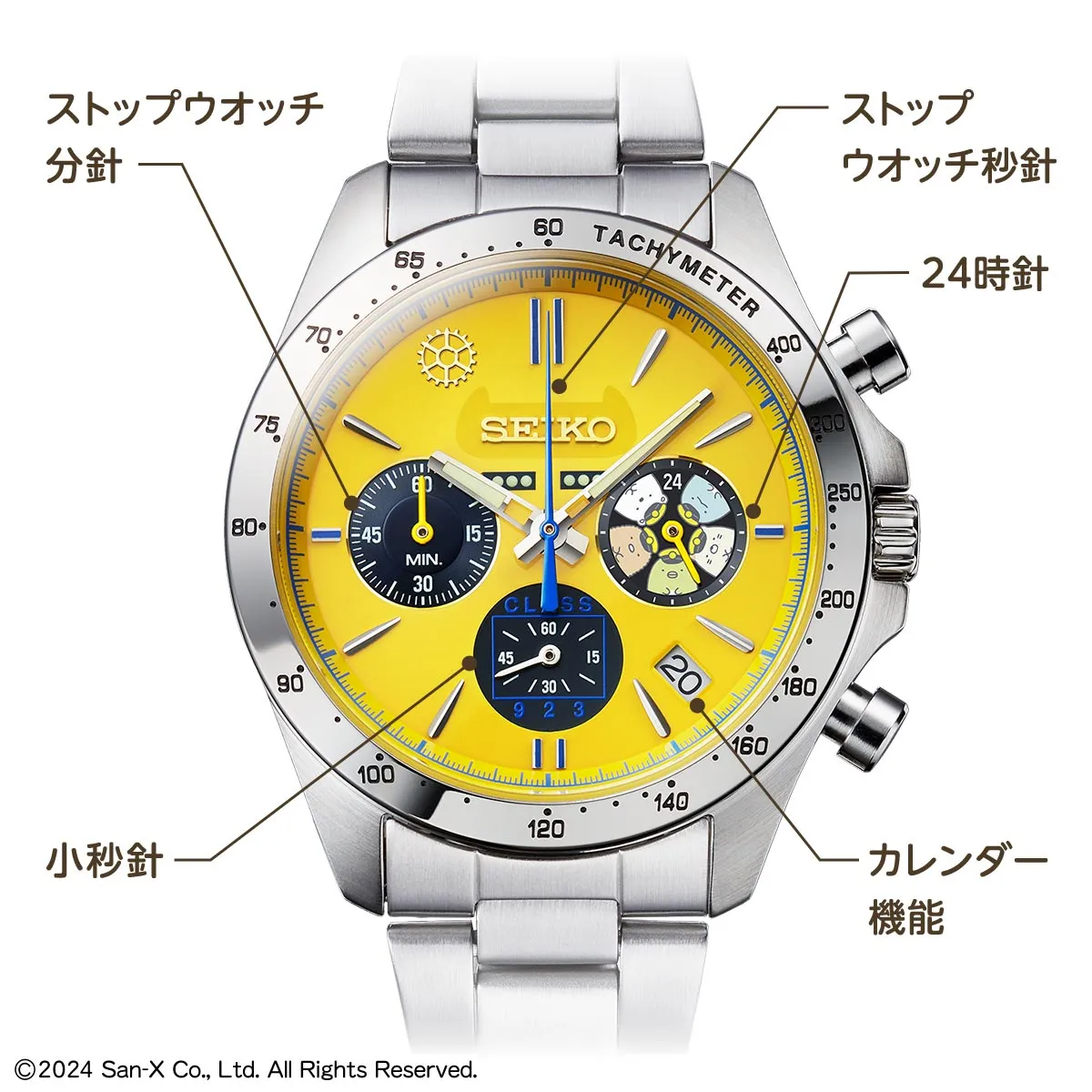 ドクターイエローの車体にちなんだ印象的な黄色の文字盤には、インデックスの深いブルーのラインがアクセントを添え、3 時位置のインダイヤルには車窓からこちらをのぞくすみっコたちがデザインされています。