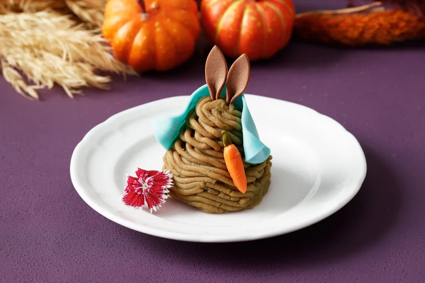ピーターはカスタードクリームと栗、生クリームが入った濃厚な栗の味わいが楽しめる贅沢な和栗のモンブランに変身。ピーターのトレードマークの青いジャケットを着せ、大好きなマグレガーおじさんの畑のにんじんを持たせた可愛らしい一品。