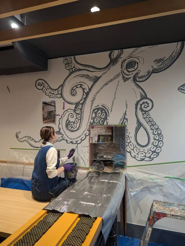 グランドオープンする「南房総 やまと寿司 あすみが丘店」の店内の壁面には、「小だるま工房」の壁画師により描かれた、「まぐろ」や「いわし」「たこ」など様々なお魚たちが、訪れる方をお迎えします。