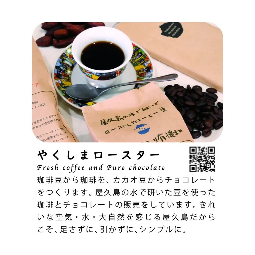 屋久島の水で研いた豆を使ったコーヒー・チョコレートの販売もしています。