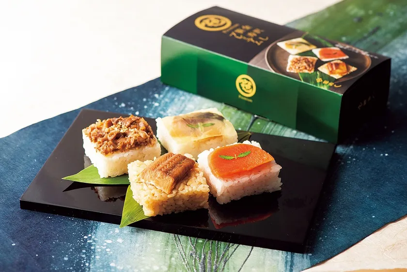 能登牛しぐれ、天然紅鮭、国産穴子、炙り鯖を天然の香り高い笹に包んだ押し寿し。