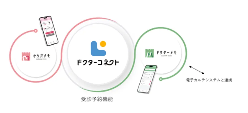 また「ドクターコネクト」の医師向けアプリケーション「ドクターメモ」に、電子カルテシステムとの連携機能を追加、患者が「からだメモ」で登録した問診情報(主訴・既往歴・アレルギーなど)を電子カルテシステム端末にBluetooth経由で転送、診療記事として登録することで転記やスキャンなど業務負荷の軽減を実現します。