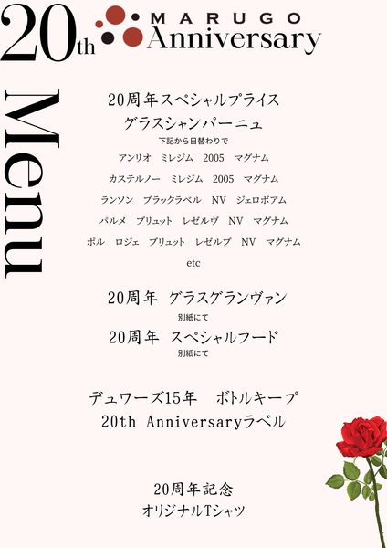 東京都内を中心に飲食事業(24店舗運営)を展開する株式会社ワルツ(本社:東京都新宿区、代表取締役:大竹 俊活)のワインバー事業1号店の「MARUGO」が2025年5月25日に20周年を迎えます。この20年間を支えていただいたお客様に感謝と、これからのMARUGOファンに向けて、5月19~25日の期間限定で特別なワインと料理を提供する「大感謝祭」を開催致します。2005年の開店以来、新宿のワインシーンを牽引してきたMARUGOだからこそ提供できる希少性の高いワインと、心躍る美食との出会いをご用意いたしました。ぜひこの機会に、グラスを片手に20年の歩みをともに振り返っていただけましたら幸いです。