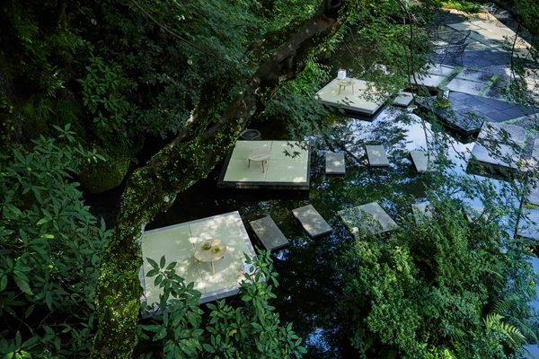 星のや京都の水の庭に、夏の期間限定で涼を楽しむ特等席として納涼床を設置します。納涼床は、夏になると川の流れに張り出すように設けられる桟敷(さじき)で、京都の鴨川に多く見られる納涼の工夫です*8。青もみじのやわらかな木陰の下で間近に落ちる滝の音を聞きながら、水に浮かんでいるかのような心地でくつろぐことができます。