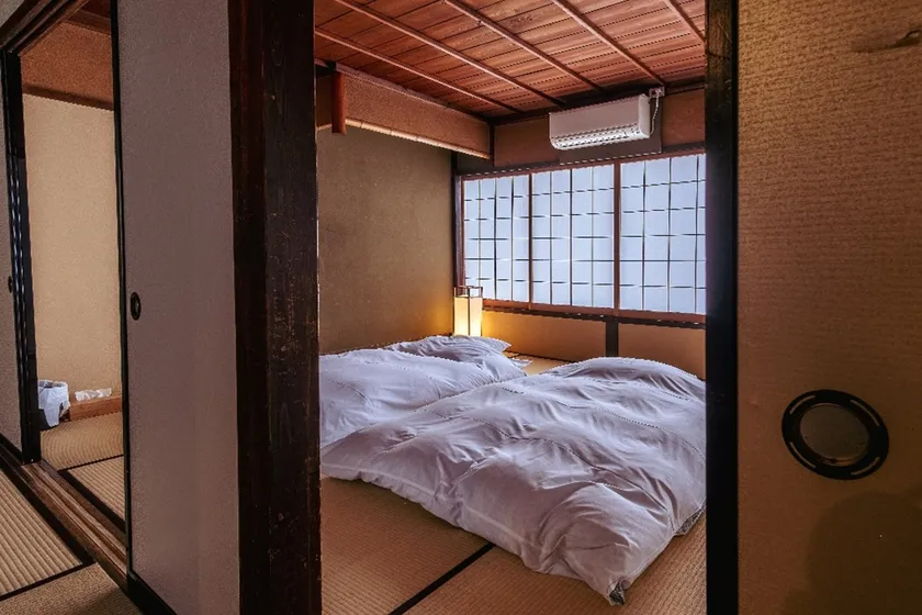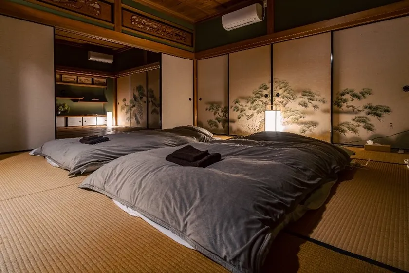 元々は蕎麦屋として活用されていた古民家を再利用。施設内は長屋式になっていて、女子会など仲間同士で楽しめる広々としたスペースの様子も実感。施設を入ってすぐにある囲炉裏も特徴の一つとなっています。重要文化財や日本遺産構成文化財などの施設も並び、伝統的建造物群保存地区に位置している風景も見どころです。