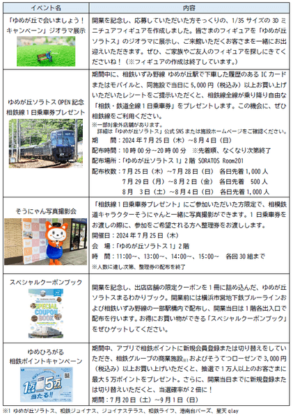 さらに、相鉄ポイントと連携した「ゆめひろがる 相鉄ポイントキャンペーン」も実施。7月20日(土)から9月1日(日)までの期間に、アプリで相鉄ポイントに新規会員登録または切り替えをしていただき、相鉄グループの商業施設※1で3,000円(税込み)以上お買い上げいただくと、抽選で最大5万ポイントが当たるキャンペーンを実施します。さらに、このキャンペーンに合わせ、ゆめが丘ソラトス開業当日〔7月25日(木)〕までに新規登録または切り替えいただくと、当選確率が2倍になります!その他、開業に向けてさまざまな企画を実施します。