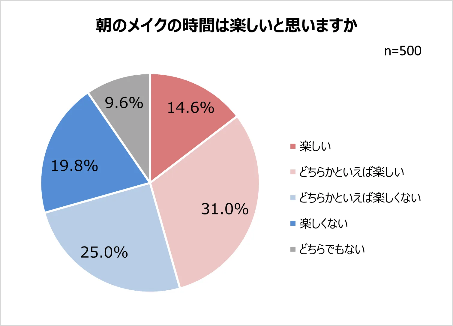 さらに、朝のメイク時間と比較すると「楽しくない(19.8%)」「どちらかといえば楽しくない(25.0%)」「どちらでもない(9.6%)」とポジティブでない割合は54.4%となり、朝のメイク以上にメイク直しは楽しくない傾向が見受けられました。
