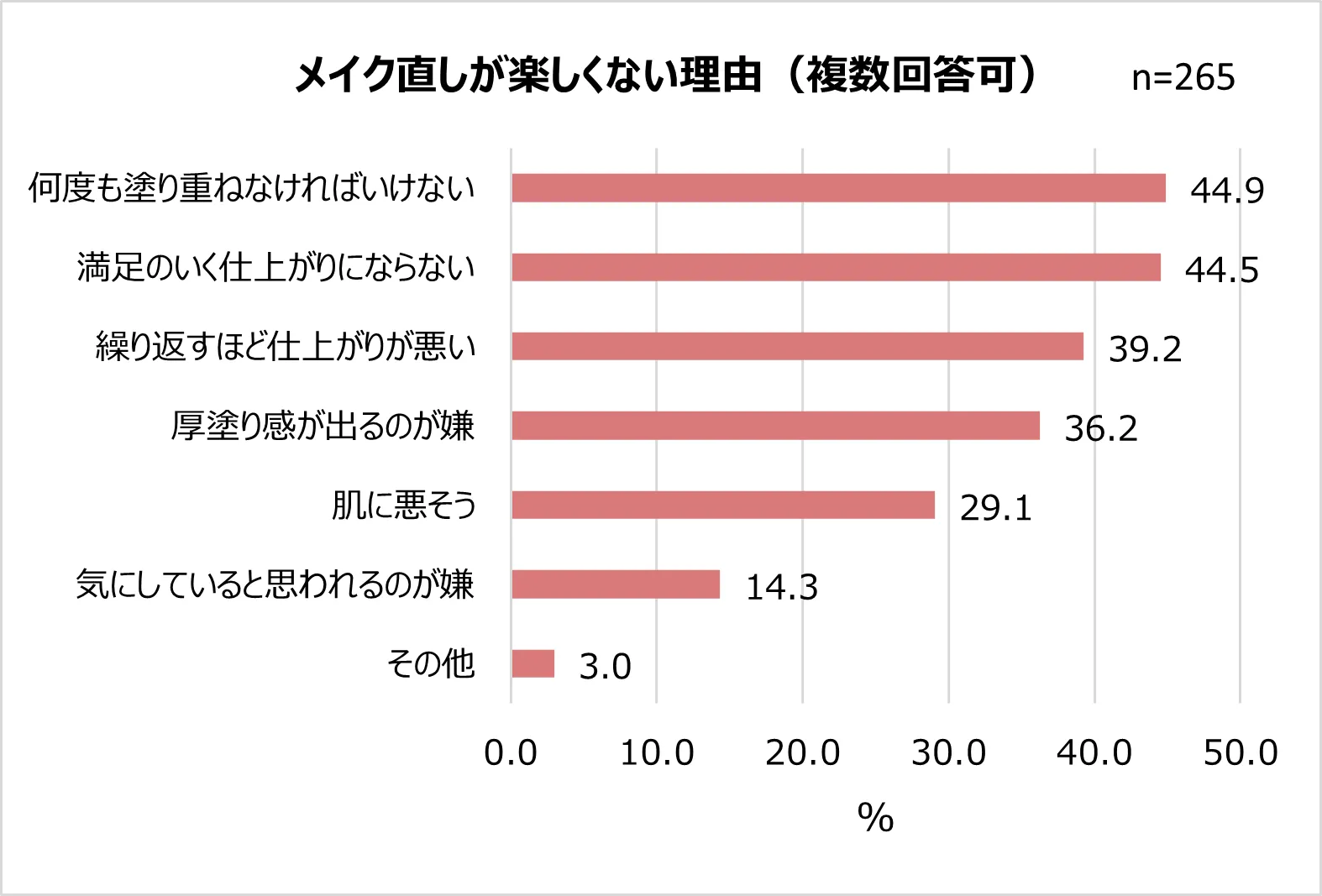 続いて「楽しくない」「どちらかといえば楽しくない」と答えた人にその理由を聞くと、TOP3は仕上がり感に関する印象が続きました。メイク直しの必要性や意義は感じている一方で、仕上がりに満足できておらず、直しても思うように直らないことから、メイク直しに対してネガティブな思いを抱く人が多いことが分かりました。