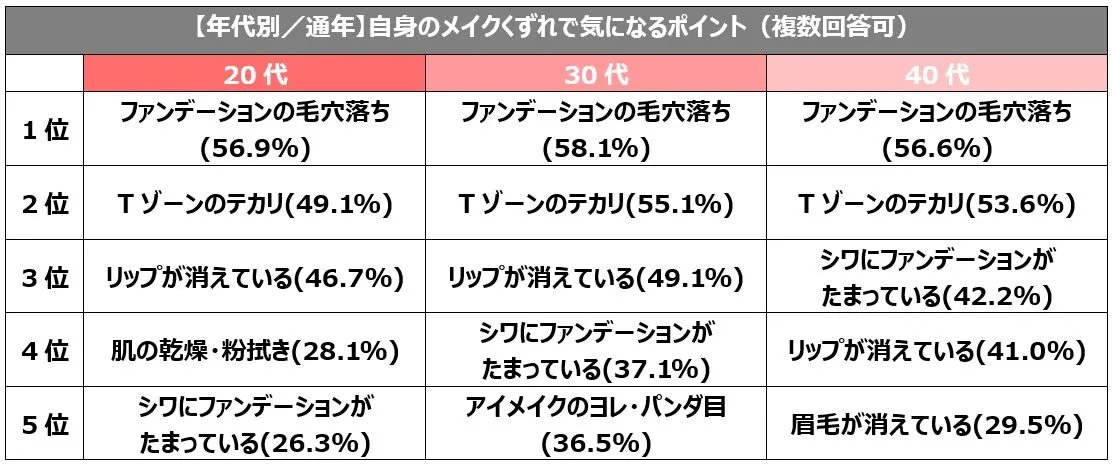 さらに、年代別でランキングにしたところ、「シワにファンデーションがたまっている(20代26.3%、30代37.1%、40代42.2%)」という回答が、20代では5位なのに対し、30代では4位、40代では3位と、年代が上がるごとに順位も上がっていることが明らかになりました。