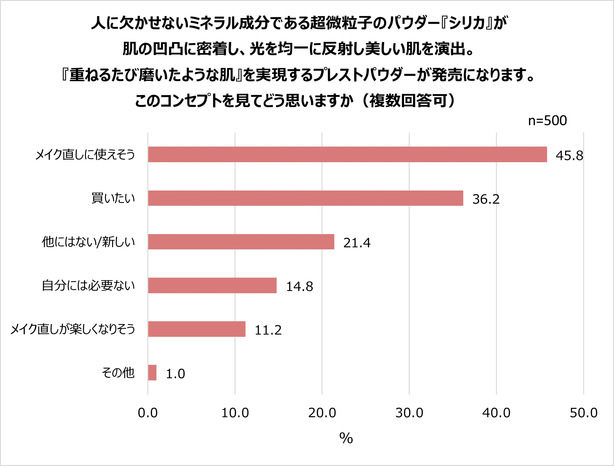 調査の中で、商品コンセプトに対する印象を聞いたところ、4割以上の人が「メイク直しに使えそう(45.8%)」と回答。「厚塗り感がなくなりそう。素肌が綺麗な人に見えそう(東京都・49歳)」や「重ねるたびという言葉が悩みとマッチしていた(福岡県・28歳)」といったお声を頂きました。