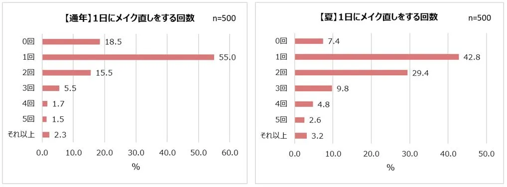 さらに詳しく、メイク直しの頻度や時間などの実態も調査。1日にメイク直しをする回数を調べると、通年では「1回(55.0%)」が最多で、次に「0回(18.5%)」、「2回(15.5%)」が続きました。夏に限定すると、通年よりも「0回(7.4%)」が約10%少なくなり、「2回(29.4%)」が約14%多くなる結果に。夏の方がメイク直しの回数が多くなる傾向が見て取れます。
