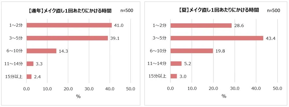 メイク直し1回あたりにかける時間については、通年では「1~2分(41.0%)」と「3~5分(39.1%)」に回答が集まり、約8割の人が5分以内にメイク直しを済ませていることが分かりました。夏では、約2割の人が「6~10分(19.8%)」と答えており、夏のメイク直しは通年よりも時間をかける人が多いことも分かりました。