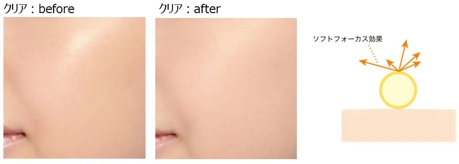 シリカが肌の凹凸に密着し、光を均一に反射し美しい肌を演出。※メイクアップ効果による