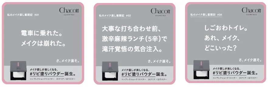 ふと自分の顔が映ってしまったときに気になるメイクくずれ。通勤に、ランチに、推し活に…。思い切り過ごす毎日は、実はメイクくずれの連続。そんな毎日のあるあるを「私のメイク直し奮闘記」と題して、ふと自分の顔が映る瞬間の電車内やトイレに掲出します。