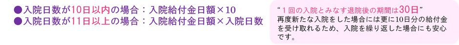 「短期入院10日給付特則」を適用した場合、継続した1回の入院について、疾病入院給付金および災害入院給付金の支払額は以下のとおりとします。