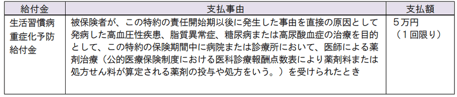※被保険者が、この特約の責任開始期以後の疾病を原因として発病した心疾患、脳血管疾患、糖尿病、高血圧性疾患・大動脈瘤等、肝疾患、膵疾患または腎疾患の治療を目的として、この特約の保険期間中に病院または診療所において、入院をしたときまたは手術を受けられたときは、その開始日に生活習慣病重症化予防給付金の支払対象となる薬剤治療を開始したものとみなします。