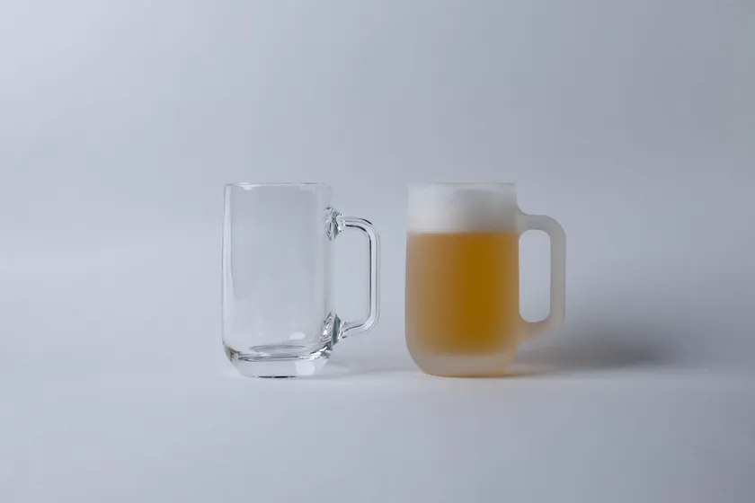 つるりとしたガラス本来の表面を持つクリアと、すりガラス調に仕上げたフロストの2種展開。ガラスの厚み感をストレートに感じられるクリアは、色も泡も氷も綺麗にキリリと映える爽快感が持ち味。一方のフロストはふんわりとした雰囲気が優しく、表面のごく微細な凹凸のおかげで泡立ちが豊かになります。