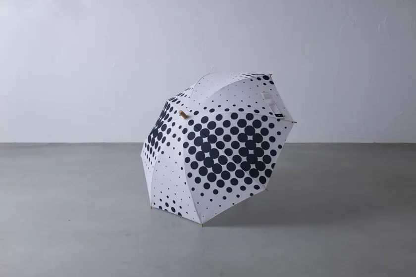 白黒の大きめドットでデザインされたシックな柄。近目では分かりませんが、遠くから眺めると実は「Fu と fu」の文字が見えてきます。大胆な遊び心が仕込まれた楽しい傘です。