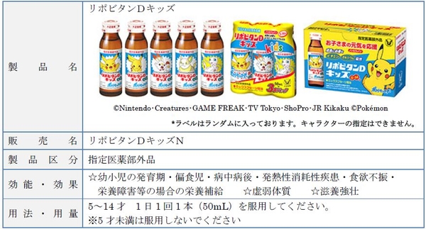 大正製薬株式会社[本社:東京都豊島区 社長:上原 茂](以下、当社)は、子ども達に大人気のTVアニメ「ポケットモンスター」(以下、ポケモン)をラベルや外装にデザインした当社製品「リポビタンDキッズ」(指定医薬部外品)、「リポビタンキッズゼリー」(清涼飲料水)を購入してご応募いただくと、アニメで活躍中のポケモンが描かれたオリジナルグッズが抽選で当たる「リポビタンキッズシリーズを買って、ポケモングッズを当てよう!」キャンペーンを7月1日(木)~8月31日(火)で実施いたします。