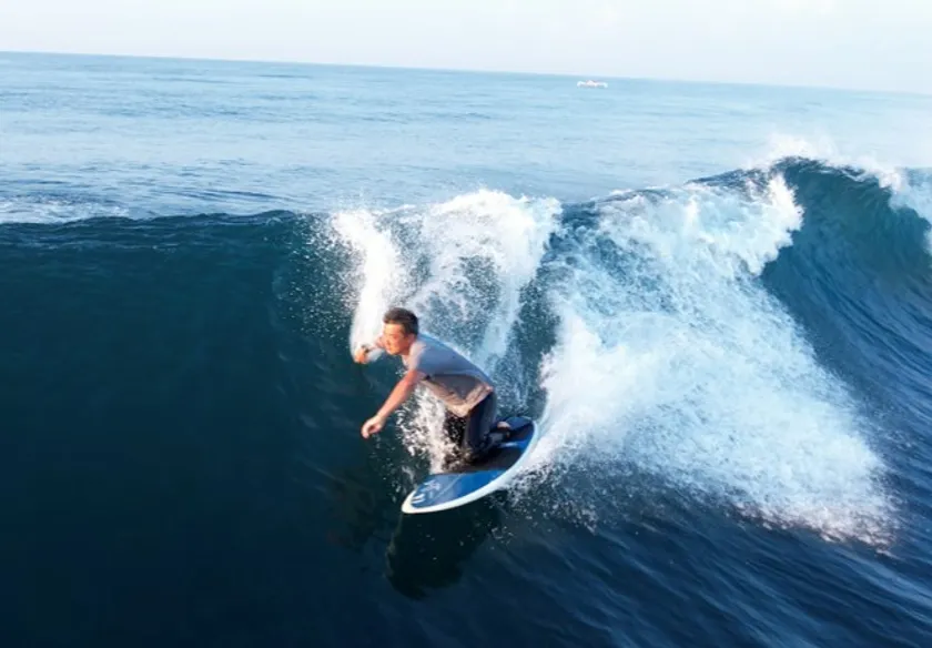 勝浦の海でサーフィンを楽しむ田井氏