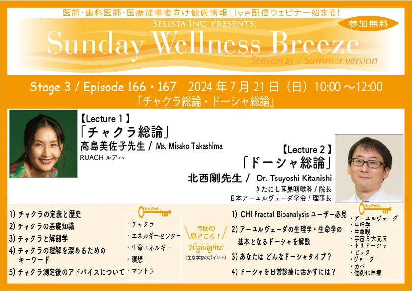 セリスタ株式会社(東京都千代田区 代表取締役 伊藤 承正)は、2024年7月21日(日)に、高島 美佐子 先生(RUACH ルアハ)、北西 剛 先生(きたにし耳鼻咽喉科/院長)を講師にお迎えし、医師・歯科医師などの医療従事者向け無料ZOOMオンラインセミナー『チャクラ総論・ドーシャ総論』を開催します。