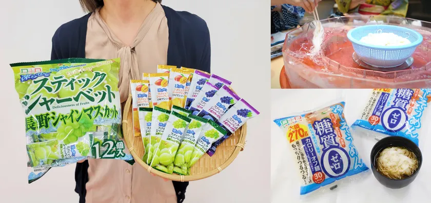 凍らせてスティックシャーベット、そうめん流し(イメージ)、糖質0冷やしそうめん風こんにゃく