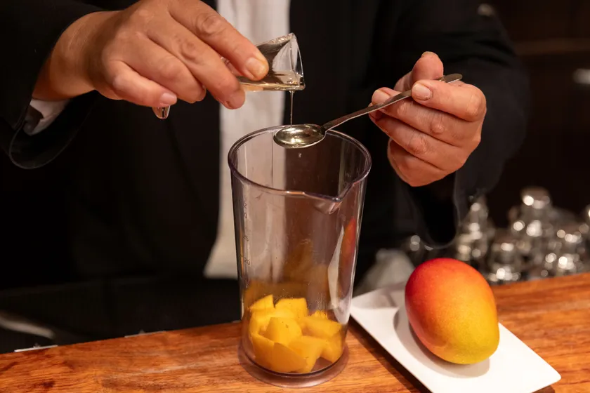 近年、健康意識が高いお客様も多く、健康的なカクテルをイメージして作る時には、香りのあるオイルを使用することが多いです。今回は期間限定で、フルーツオイルにMCTオイルとアマニ油を使用したカクテルを提供いたします。「ベジタブル&フルーツオイル」というキーワードでフルーツをオイルに漬け込み、香りや風味をうつしています。オイルを使うことでカクテルのうまみを引き立てながら、甘みとコクが見事に調和します。
