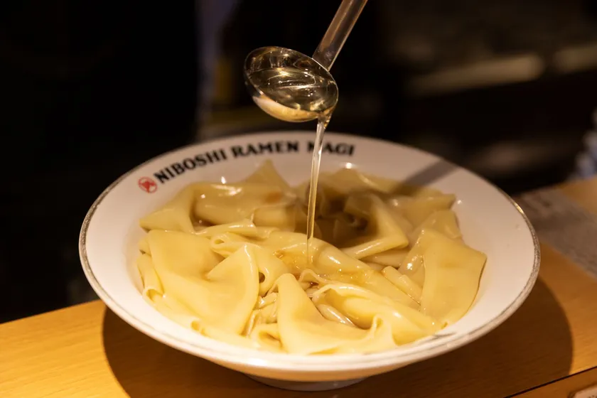 煮干2種と昆布カツオのめんつゆにアマニ油を合わせたつゆを使用。アマニ油を合わせることで、煮干の味が引き立てられ、より感じやすくなります。凪オリジナルの幅広麺「いったん麺」を使用することでつゆを挟み込みあますことなく食べられます。また、油がはいることで口当たりよく、食べたときにつるっとした食感をお楽しみいただけます。