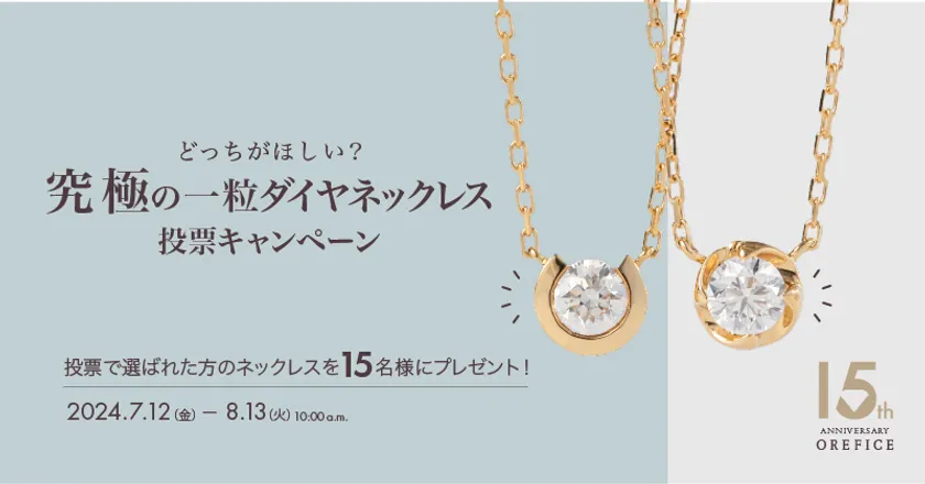 株式会社ジュエリー工房Orefice(所在地:東京都港区、代表取締役社長:中村 誠)は、ジュエリーブランド「オレフィーチェ」が15周年を迎えたことを記念し、K18×天然ダイヤモンド0.15ctのネックレスが15名様に当たる豪華プレゼントキャンペーン「【15周年記念企画】どっちが欲しい?究極の一粒ダイヤネックレス投票」を開催いたします。