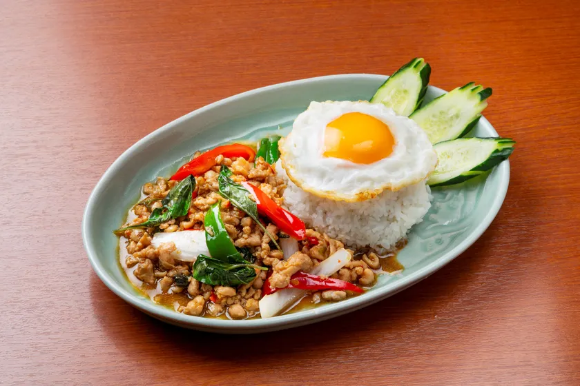 タイの屋台や食堂で人気No.1メニュー!ホーリーバジルというタイのハーブと鶏挽肉の相性がすばらしい一品。揚げた目玉焼きは必須で、半熟の黄身を混ぜながら食べるのがタイ流です。
