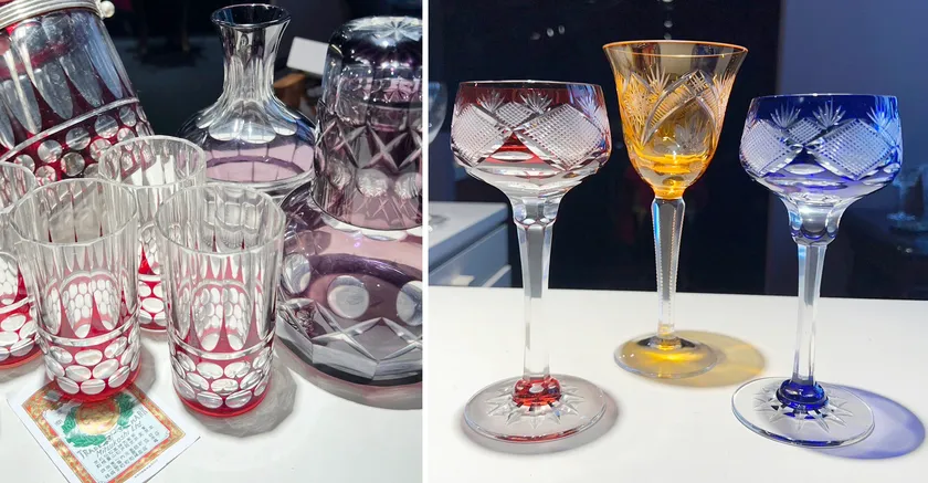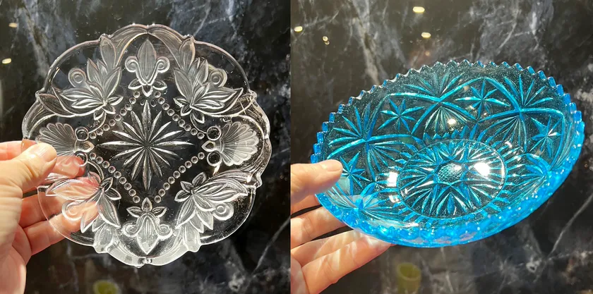 型吹きガラスに比べてより鮮明に型の模様を写し取ることが可能であり、厚くて丈夫という利点があります。