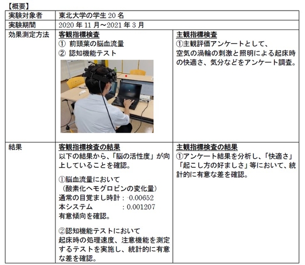 東北大学加齢医学研究所 川島隆太教授との共同研究により、本システムによる空気の渦輪と照明が起床に及ぼす効果について、一般の目覚まし時計との比較実験を実施しました。