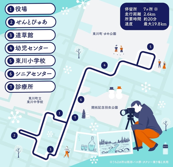 北海道の東川町(町⻑:松岡市郎)およびソフトバンク株式会社の⼦会社であるBOLDLY株式会社(ボードリー、代表取締役社⻑ 兼 CEO:佐治 友基、以下「BOLDLY」)は、2023年3⽉6〜10⽇に、東川町の町役場や道の駅ひがしかわ『道草館』などを通る1周約2.6kmのルートで、⾃動運転バス「NAVYA ARMA(ナビヤ アルマ)」(仏Navya社製)の試運行※1を実施します。試運行では、雪道における自動運転バスの走行を検証するとともに、町役場や道の駅周辺などの町内で交通量が多い市街地で関係者向けの試乗会を開催し社会受容性を調査するのを目的に、1日に約15便(調査研究用:約12便、試乗会用:3便)を運行します。