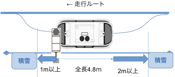 除雪作業により路肩に寄せた雪が走行ルート上にはみ出していると、自動運転バスが障害物として検知してブレーキがかかります。東川町の都市建設課とBOLDLYは、連携して除雪作業を実施するとともに、除雪した雪を十分に路肩に寄せてルートの整備を行います。また安全性を担保できる範囲内で、走行ルート自体をやや中央線寄りに設定する工夫も行います。バス停付近では、自動運転バスが路肩に寄って停車するため、さらに除雪が必要です。下の図の通り、バスの停車位置から横30cm以上、前方1m以上、後方2m以上の除雪を実施し、安全にバス停で停車できる環境を整えます。