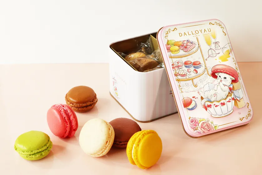 1832年から受け継がれてきたダロワイヨ人気のマカロン5種を、限定パッケージに詰め合わせました。お茶会に紛れ込んでしまったジョセフィーニャをデザインした限定缶ギフトです。