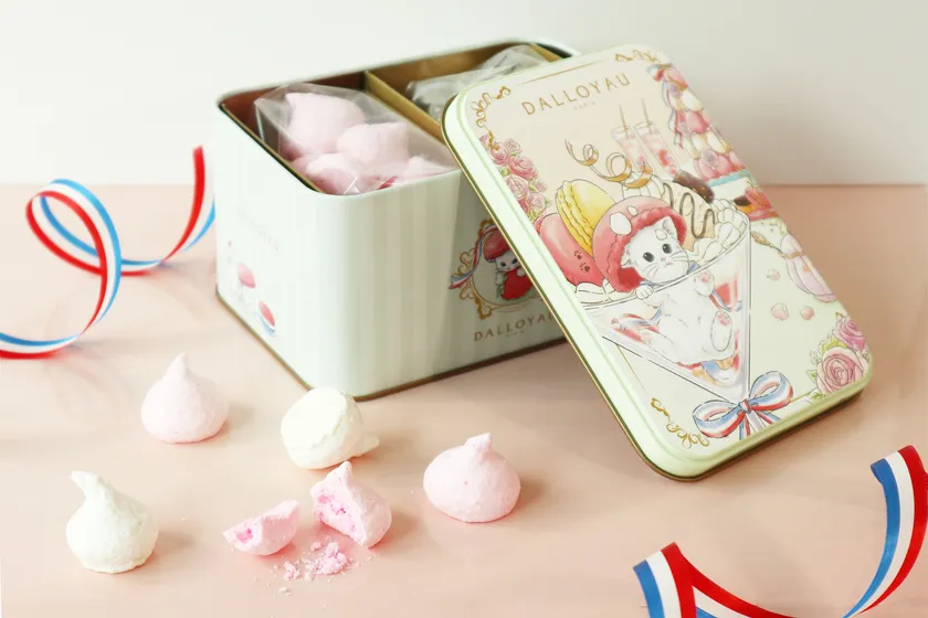 メレンゲでできたカラフルな「スフレ」を、ジョセフィーニャデザインの限定缶に詰め合わせました。フレーバーは、ココナッツと苺の2種類が入っています。