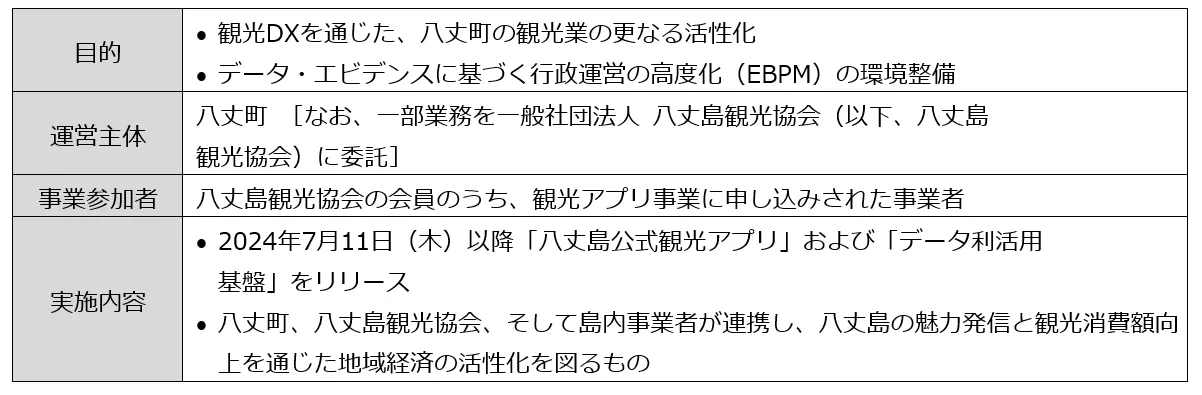 本事業は、東京都の「東京宝島 サステナブル・アイランド創造事業」の枠組みを用いて、デジタル技術やデータ利活用により、地域の魅力創出・発信と地域経済の活性化を狙いとするものです。