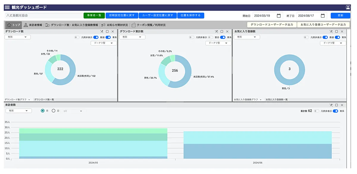 観光アプリの利用状況は、一覧形式のほか、各種グラフ(円グラフ、縦棒グラフ、横棒グラフ等)等で、視覚的にデータ確認可能