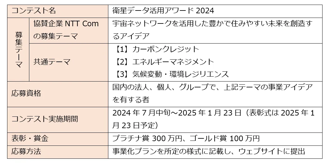 本プログラムは、グリーン分野で衛星データを活用する事業アイデアを募集します。また、優れたアイデアを有する個人・企業などを表彰し賞金を授与することで、事業化を支援します。