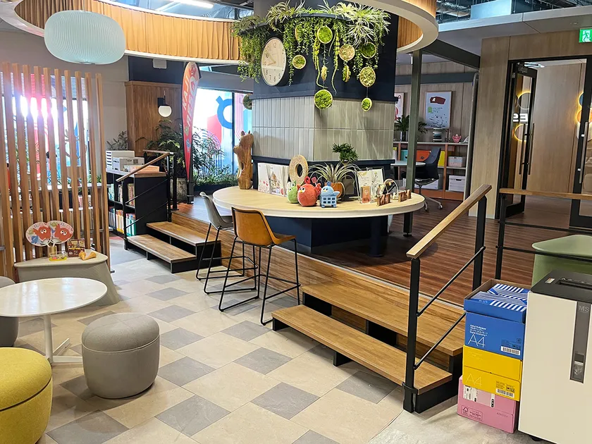 オフィスのメインフロアから、小上がりになったウッド調のフロアへ上る階段として、間口1.5m×2段のひな壇階段(オープンタイプ)を2セット提供いたしました。