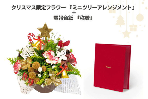 クリスマスツリー柄の電報台紙『クリスマスツリー』を組み合わせた贈り方の一例です。